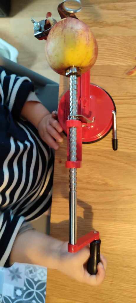 Si vous souhaitez vous équiper avec un pèle-pommes celui que j’ai fait très bien l’affaire. Mon « presque 2 ans » l’utilise facilement. Il pèle et découpe les pommes (mais aussi poire, pommes de terre, etc…). C’est celui-ci : pèle-pommes