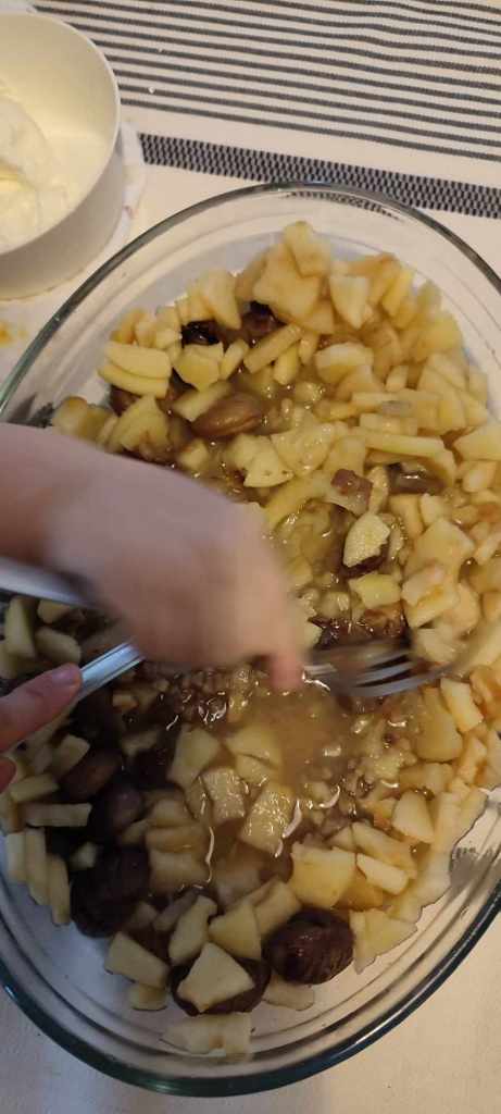 7. Écrasez les pommes et les châtaignes avec des fourchettes pour obtenir de la compote. Si les pommes sont encore trop dures remettez un petit coup au micro-ondes pour les ramollir.