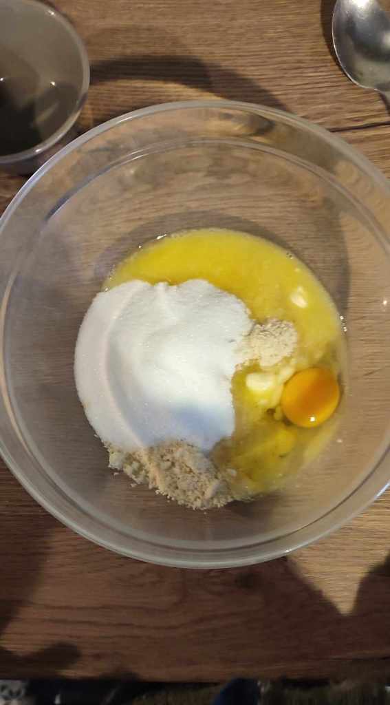 1. Mettre dans un saladier la poudre d’amandes, le sucre, le beurre et 1 oeuf.