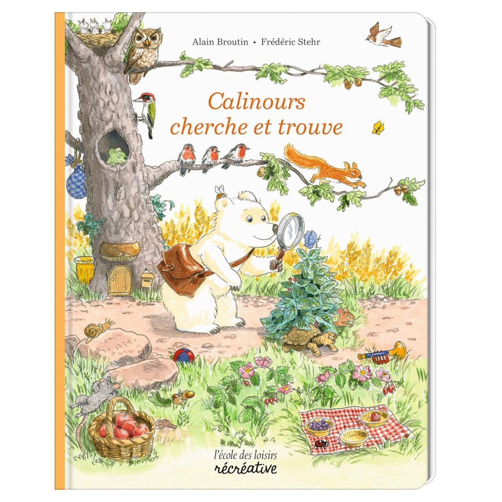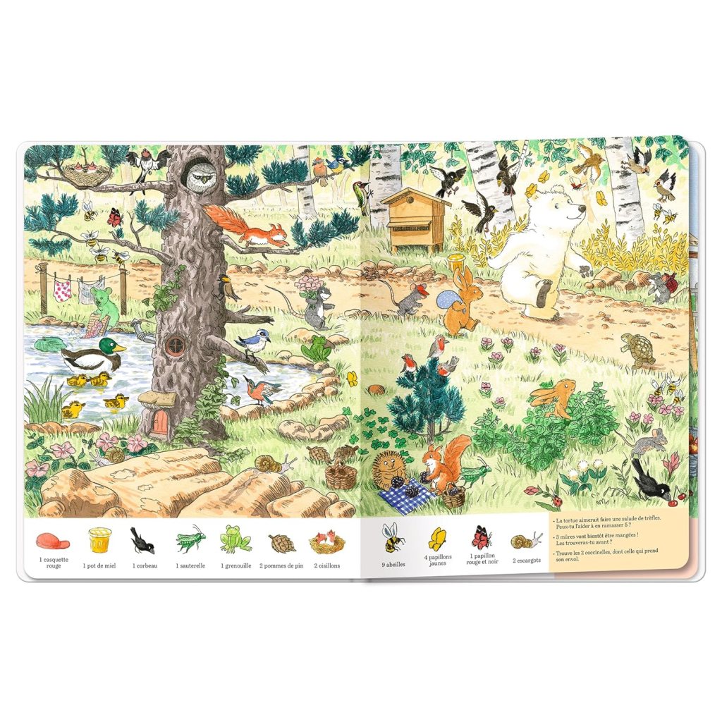 1/ Gros coup de coeur pour le Calinours cherche et trouve, chez l’école des loisirs. Déjà il est magnifique : les illustrations sont douces; c’est fin, c’est beau ! Ensuite ce que j’aime beaucoup c’est la référence aux classiques histoires de Calinours. Pour les adeptes de ce petit ourson, on retrouve par exemple une page cherche-trouve qui fait référence à Calinours va à l’école. Autre petit plus que j’apprécie : en plus du « cherche et trouve » classique où on associe l’image à trouver (en bas de la page) au dessin dans la double page, il y a, là en plus, des éléments à trouver en faisant travailler la compréhension par le biais de petites questions ou consignes (exemple : trouve les deux coccinelles dont celle qui prend son envol)