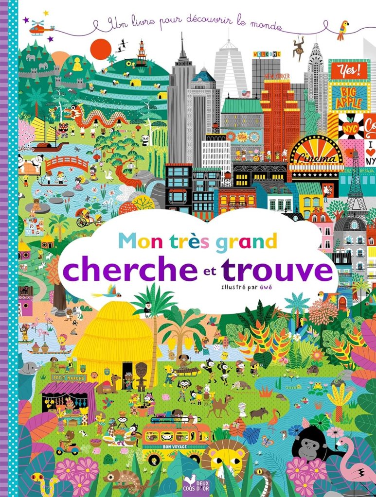 3/ Mon très grand cherche et trouve pour découvrir le monde, sorti aux éditions Deux coqs d’or. C’est le même principe que le précédent : un très grand format, des dessins très mignons sauf que cette fois les double pages abordent deux grandes villes (New York et Paris) ainsi que les continents (Asie, Afrique, Amérique du Sud). Il est tout aussi bien mais pour les plus jeunes je pense qu’il vaut mieux commencer par celui des animaux, plus parlant. En revanche celui-ci peut être super dans le cadre d’un voyage ou de la découverte d’une ville comme Paris. Une fois sur place, les enfants seront contents de retrouver la même chose que dans leur livre !