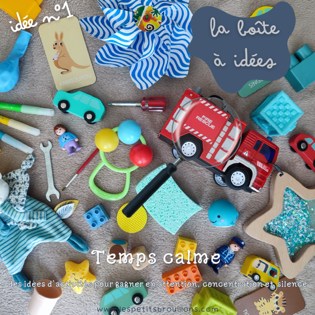 Chez nous, le temps calme c’est plutôt le matin (l’après-midi c’est encore les âges de la sieste !). Quand les réveils sont trop matinaux (et les tentatives pour recoucher les enfants trop infructueuses), c’est un créneau avant le petit-déjeuner « ce n’est pas encore l’heure de prendre le petit-déjeuner. Normalement à cette heure-ci tu devrais encore être en train de dormir. En attendant l’heure du petit-déjeuner, je te propose un temps calme ». Autre option, c’est un créneau entre le moment où mon crapaud (2ans) est prêt et l’heure de départ pour la crèche.