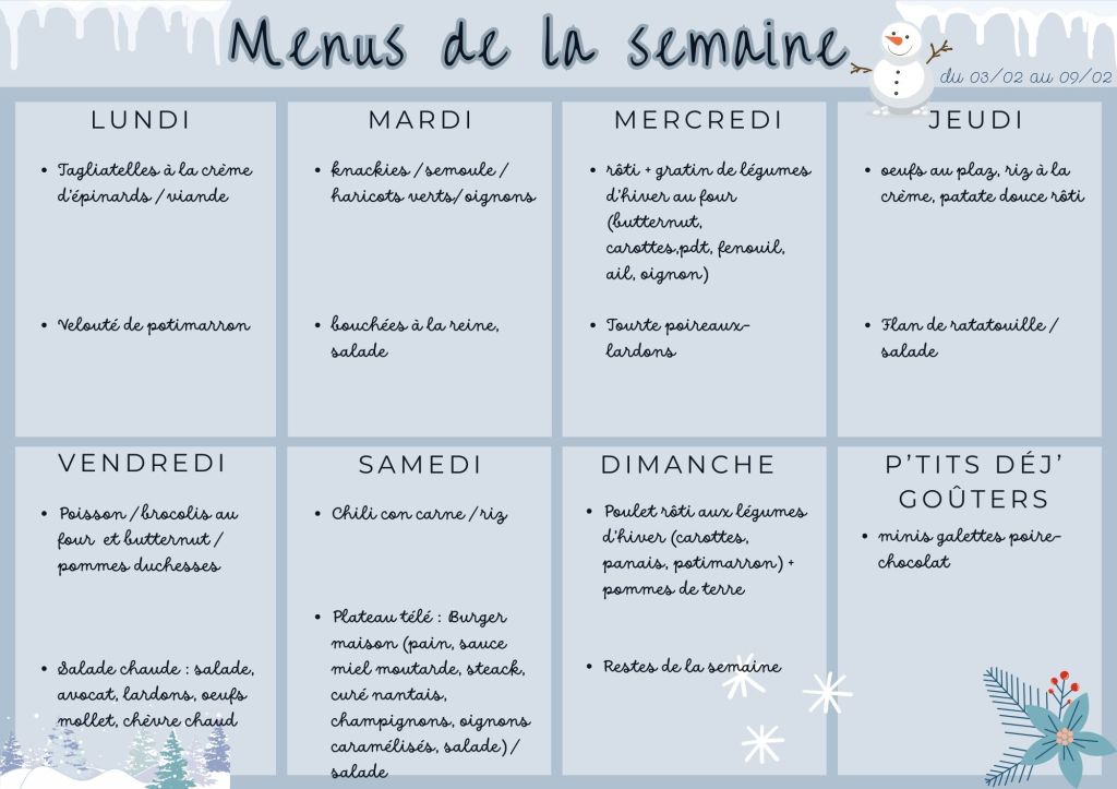 Voici déjà venues les vacances d’hiver pour ma zone en tout cas et je m’aperçois que je n’ai absolument pas pris le temps de vous partager nos menus de ce début d’année ! Cette nouvelle petite rubrique avec les menus d’automne vous a bien plu, et j’en suis ravie ! Merci à ceux qui ont pris le temps de laisser un petit commentaire (vraiment c’est pas grand chose pour vous, mais moi ça me fait réellement très plaisir de savoir que ce que je vous partage vous intéresse et ça m’aide également à continuer les partages et faire connaître un petit peu plus mon blog. Alors si vous passez par-là et que cet article vous plaît ou vous inspire, n’hésitez pas ! Même un tout petit merci tapé en trois secondes me mettra en joie et m’aidera ! Merci!)