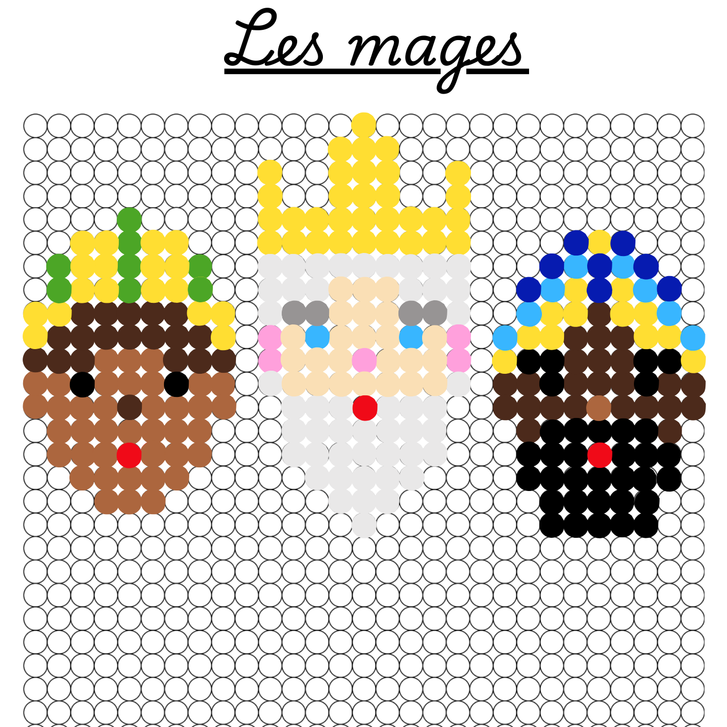 1 – Sur la plaque carré, reproduire le modèle des Mages avec les perles à repasser. Repasser la réalisation à l’aide du papier sulfurisé et du fer à repasser. Puis détachez-la du support.